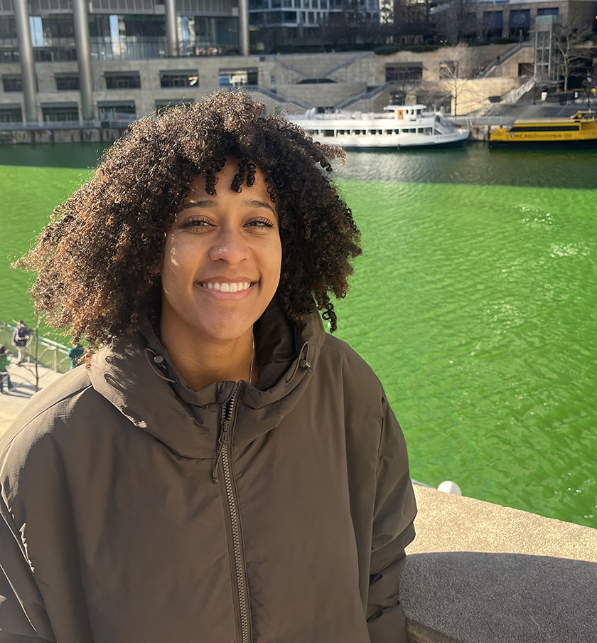 Sarah-Eden in front of a very green Chicago RiverPhoto of a woman in downtown Chicago amidst St Patrick's Day festivities